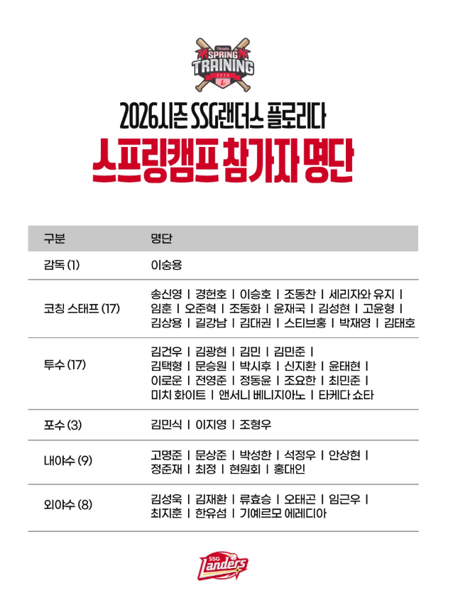 SSG 랜더스는 오는 1월 23일(금), 인천국제공항을 통해 1차 전지훈련지인 미국 플로리다로 출국합니다. 약 한 달간 진행되는 이번 캠프는 2026 시즌 성패를 가를 아주 중요한 시점이 될 것입니다.
