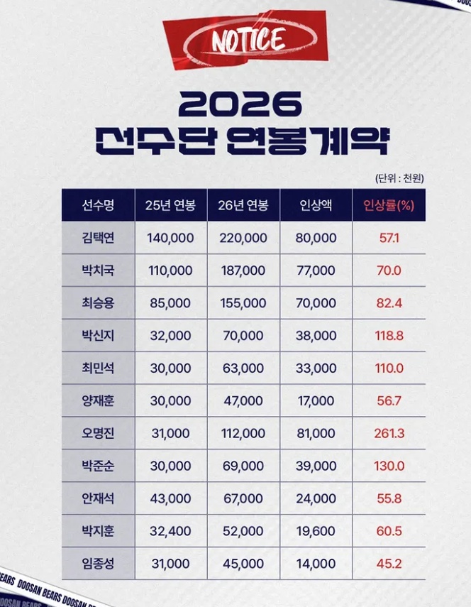 - 박치국 (1억 8,700만 원): 부상을 털고 다시 건강한 모습으로 불펜의 핵심 역할을 수행한 보상을 톡톡히 받았습니다.